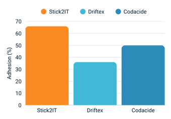 Figure 2: Comparative droplet adhesion (%) on waxy cabbage seedling leaves. All products applied @0.5% dilution.